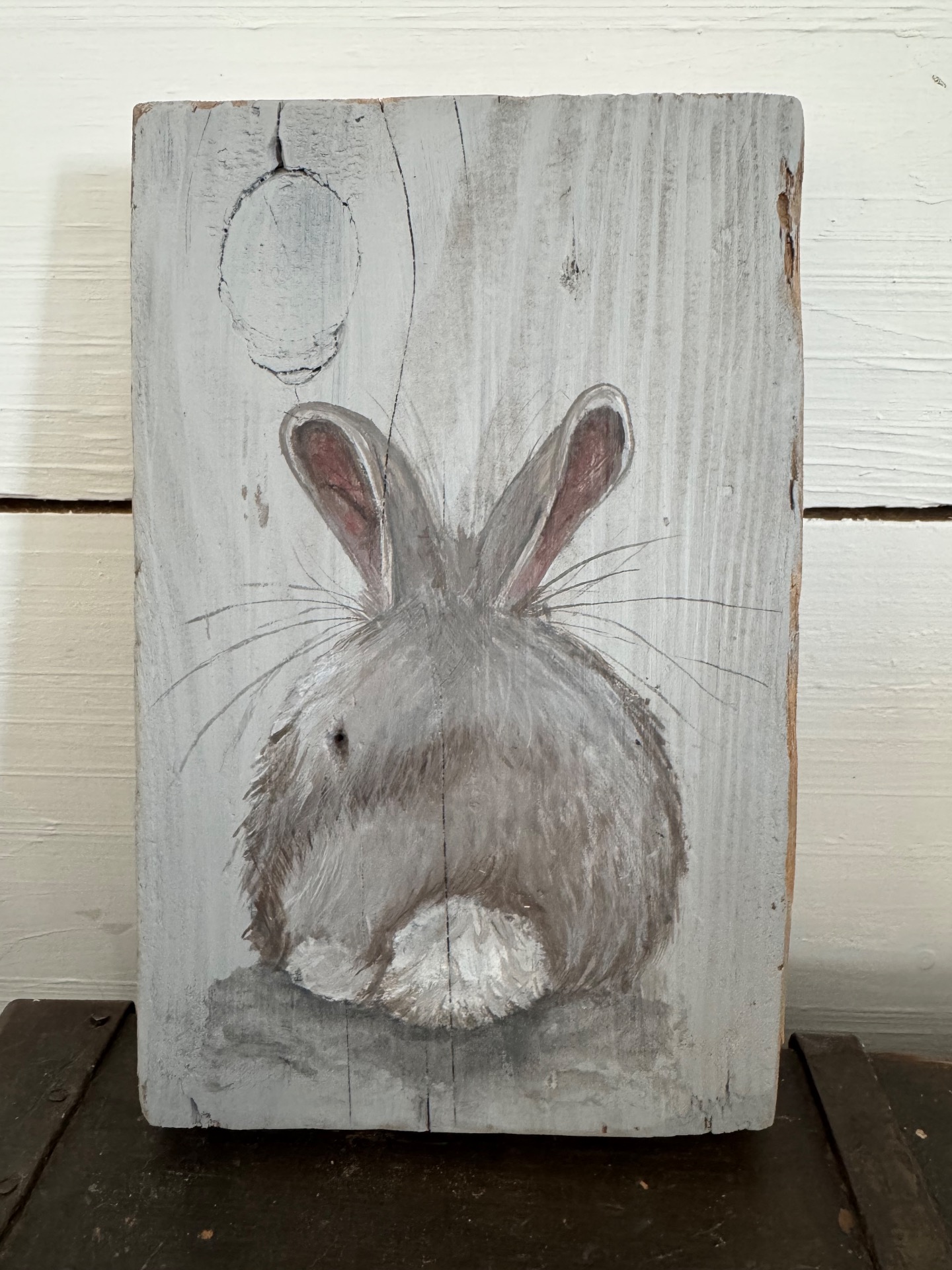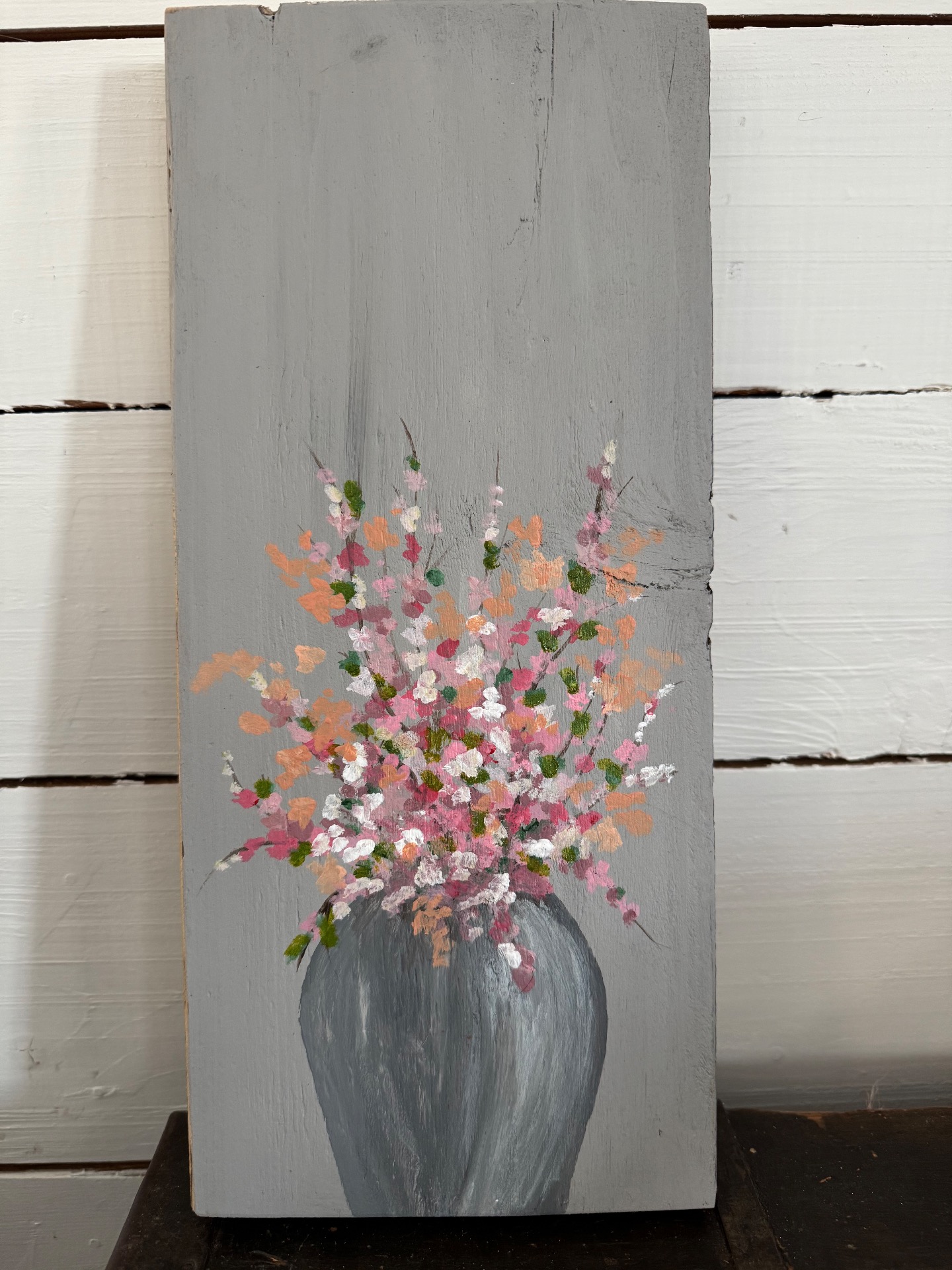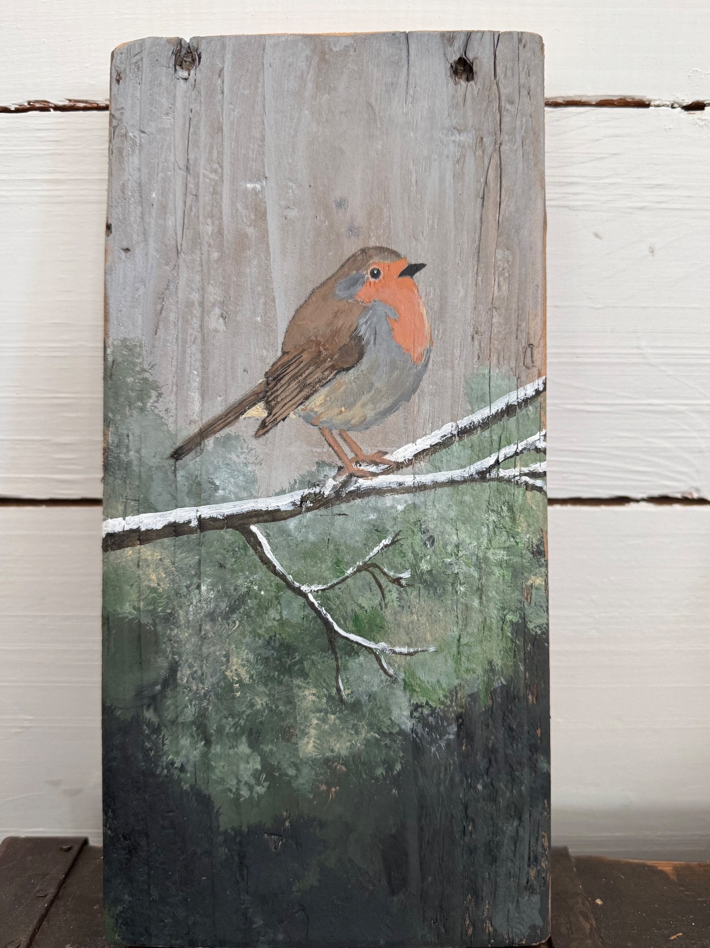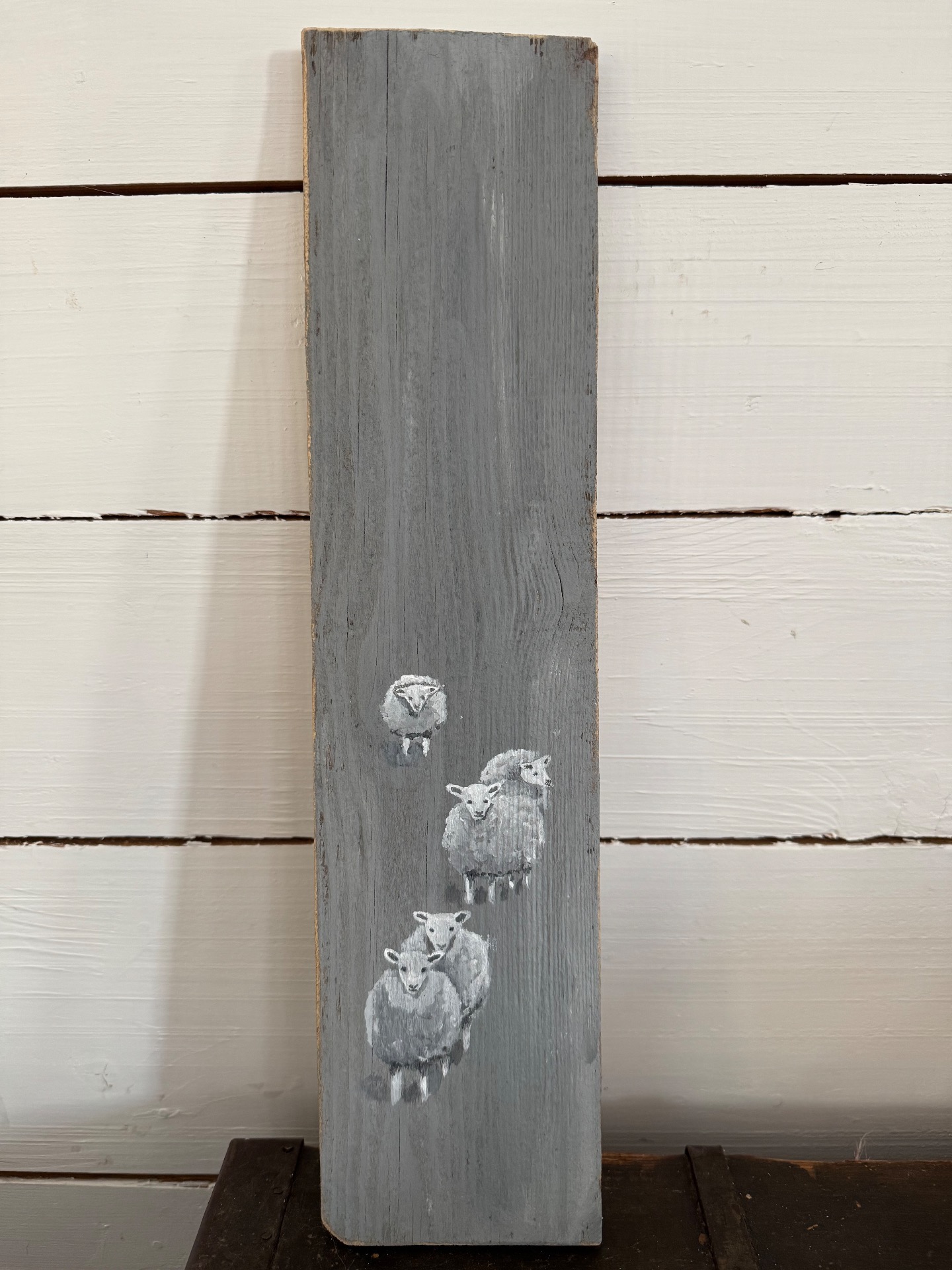 Jag målar med akryl på träbitar från återvunnet trä. Det gör att bitarna kan vara väldigt olika i storlek. Både i längd, bredd och tjocklek. De är oftast lite ojämna och har kanske hål efter spik och skruv i sig. Vilket gör dem extra charmiga och unika. Jag har inte gjort någon upphängning på dem utan överlåter till köparen att bestämma om den ska stå lutad mot en vägg eller få en krok.