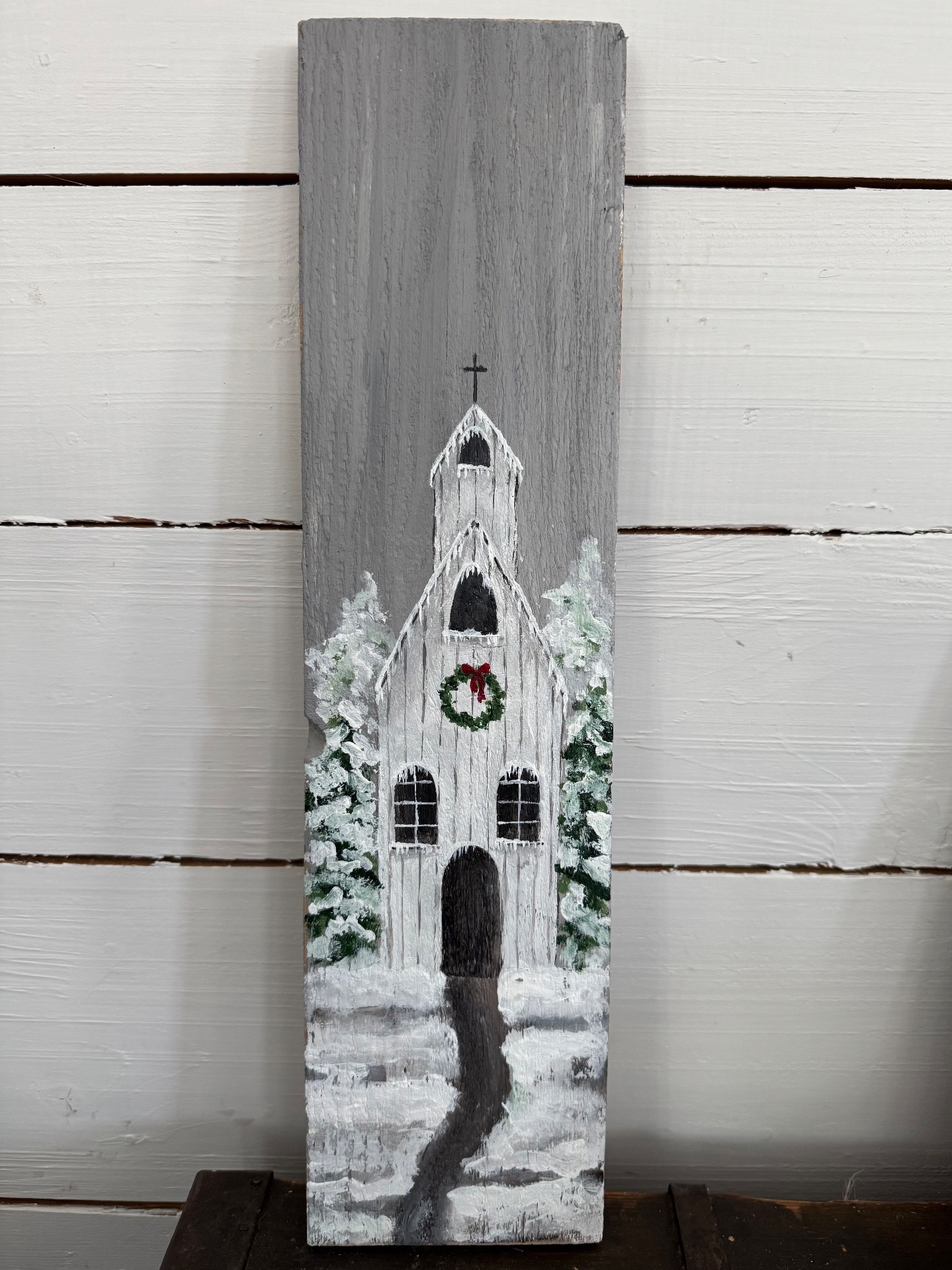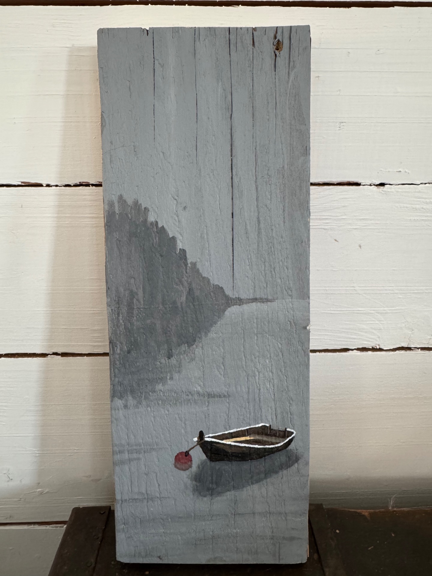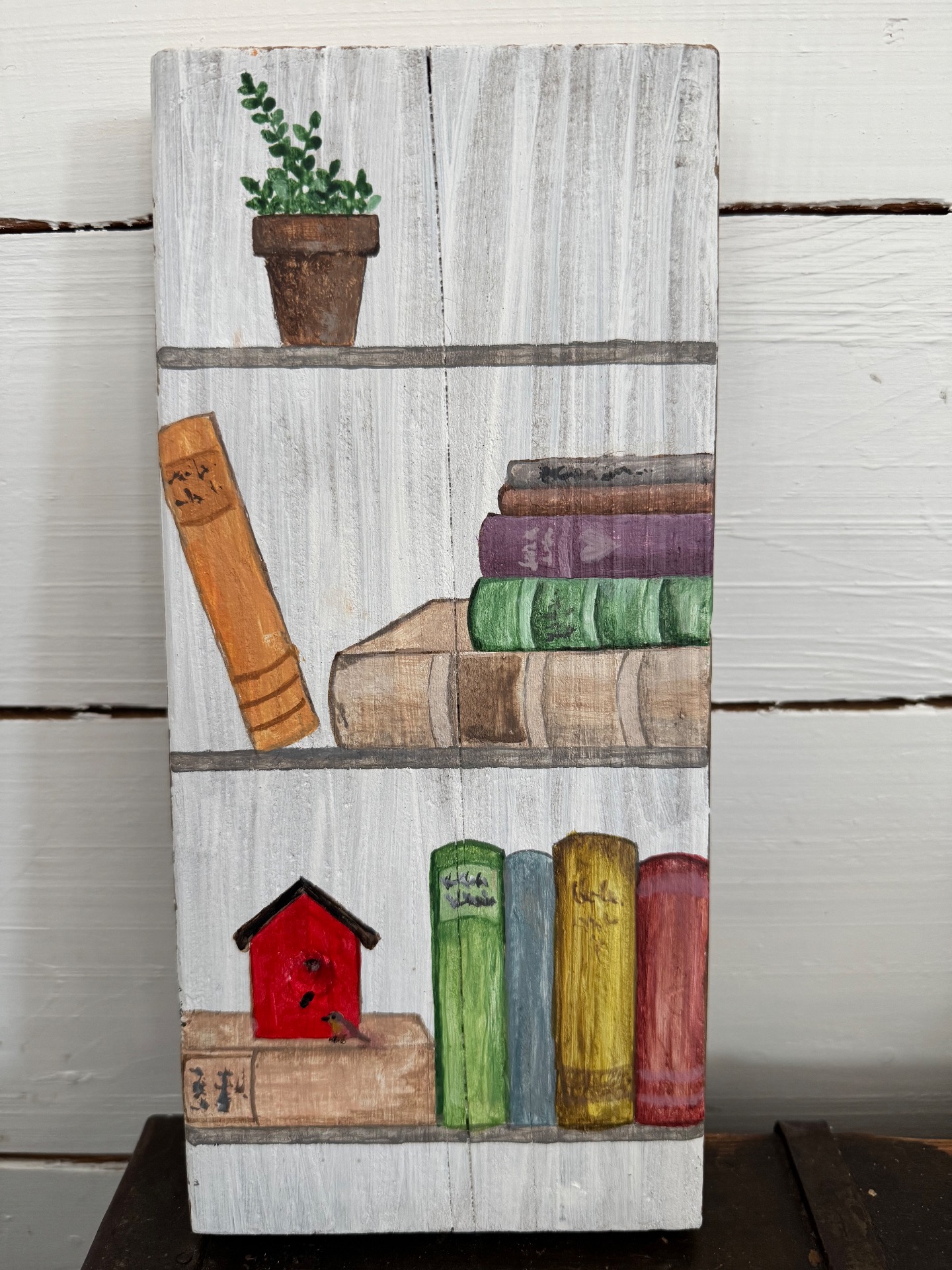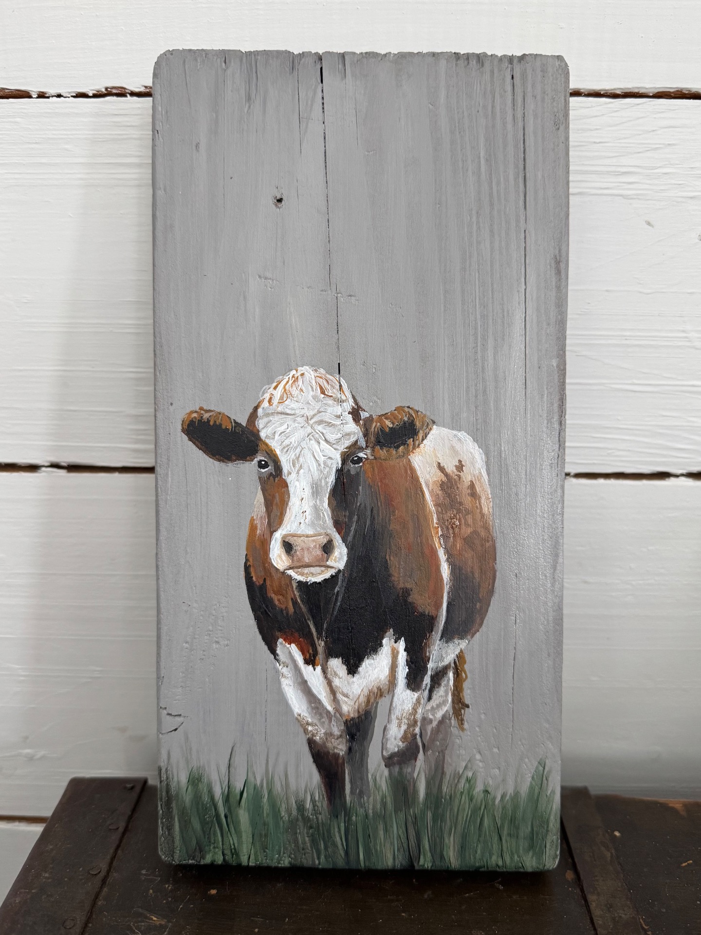 Jag målar med akryl på träbitar från återvunnet trä. Det gör att bitarna kan vara väldigt olika i storlek. Både i längd, bredd och tjocklek. De är oftast lite ojämna och har kanske hål efter spik och skruv i sig. Vilket gör dem extra charmiga och unika. Jag har inte gjort någon upphängning på dem utan överlåter till köparen att bestämma om den ska stå lutad mot en vägg eller få en krok.